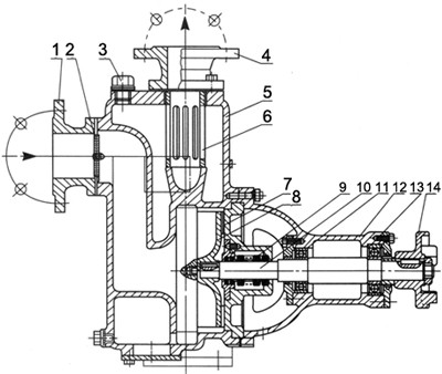 ZW型無堵塞自吸排污泵為單級(jí)單吸臥式,吸入口為軸向吸入,排出口為垂直向上,自吸入口向電機(jī)端看為順時(shí)針方向旋轉(zhuǎn)。