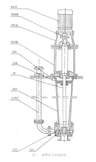 3泵的結構(圖1)特點是泵體通過接管與軸承套聯接,上下軸承即安置在軸承套內。在本系列泵中,軸承套壓蓋均為同一尺寸、同樣型號,以方便互換。因此泵軸在軸承段均有同樣尺寸。整個泵體通過軸承套和底板聯接,底板亦具有規格。適合我國目前中小型復肥生產工藝裝備要求,泵軸承采用鈣鈉基潤滑油潤滑、運行可靠,檢修泵葉輪時只需拆下前蓋,即可拿下葉輪;泵接管內裝有擋圈,軸上套有橡膠擋流圈,可以有效地防止液體濺入軸承內。